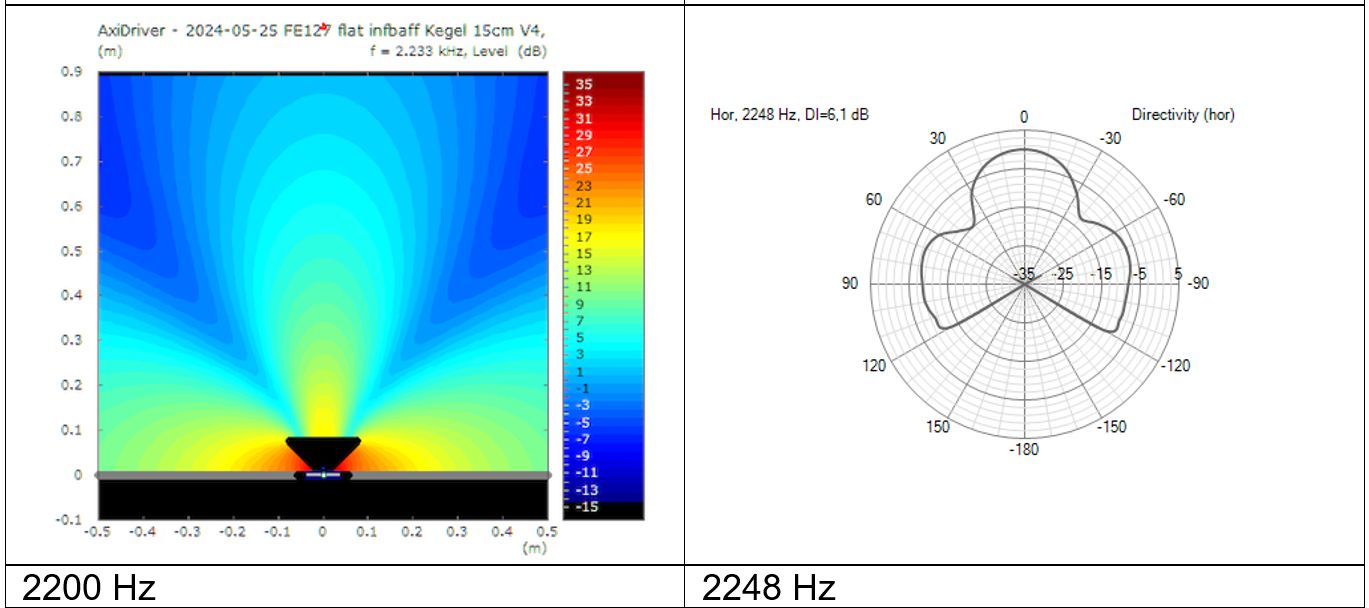 Ein kleiner messtechnischer Vergleich mit der Simu von Christoph. Leider nicht 1:1, da kein FE127 vorhanden war. Ersatzweise wurde ein Sica Coax mit in etwa gleichem Sd verwendet. Auch der Reflektor ist nur annähernd vergleichbar, es handelt sich um den 130 mm Intertechnik-Kegel. Ferner noch Messungen zum Abstand des Reflektors (39 mm = Kegelspitze ca. 2 mm über der Kalotte des Hochtöners)