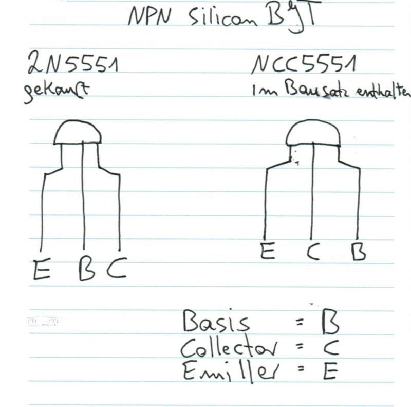 Die Pins "Basis und Collector" sind bei den im Bausatz / Schaltung enthaltenen NCC5551 sind im Vergleich zu den Standard 2N5551 vertauscht. Nur der Emitter ist an der richtigen Stelle.