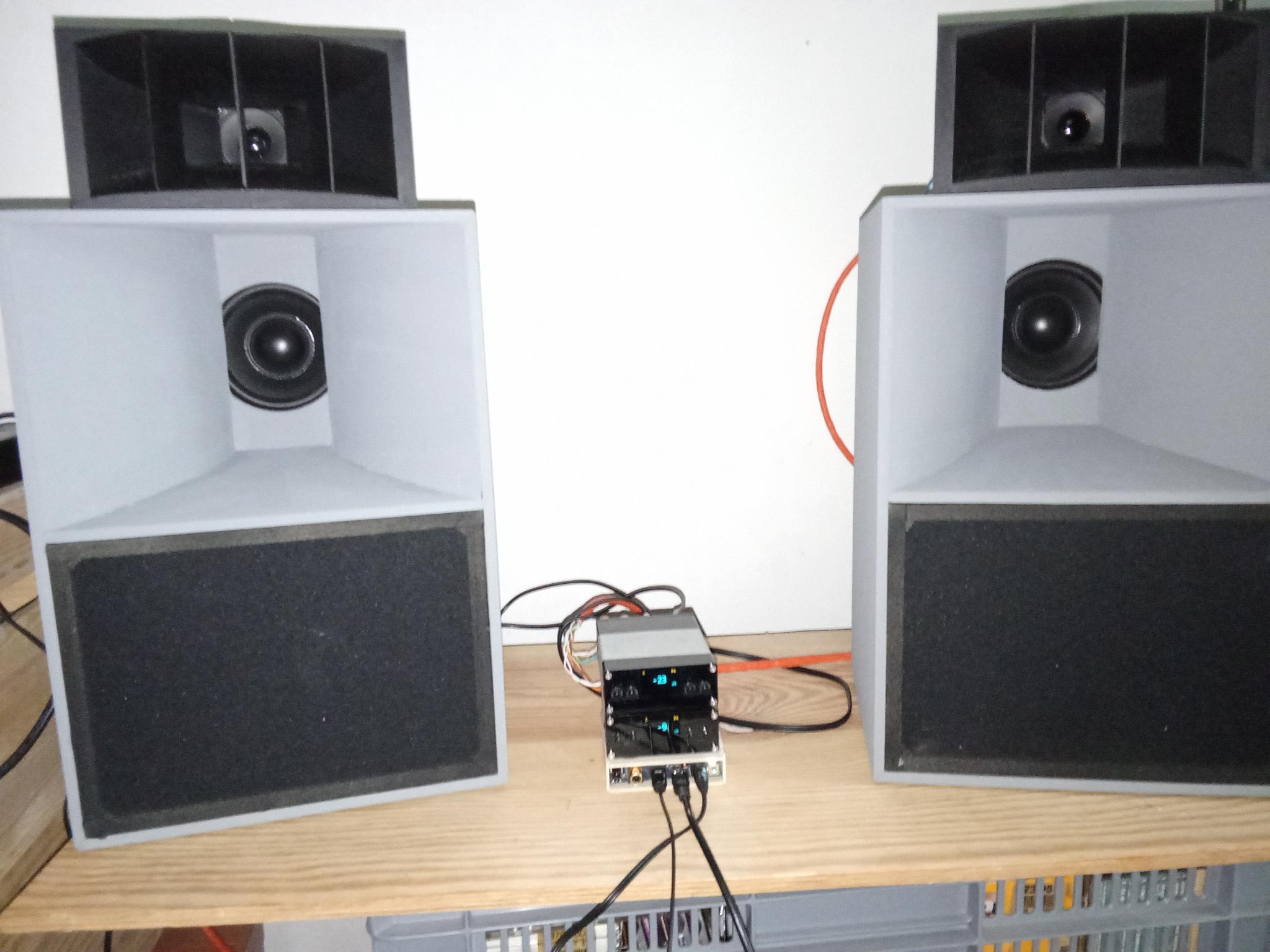 Aktuelle Weiche per miniDSP2x8 nanodigi und Verstärkung per 2 Amper502, das ist klein und passt prima auf den Schreibtisch.