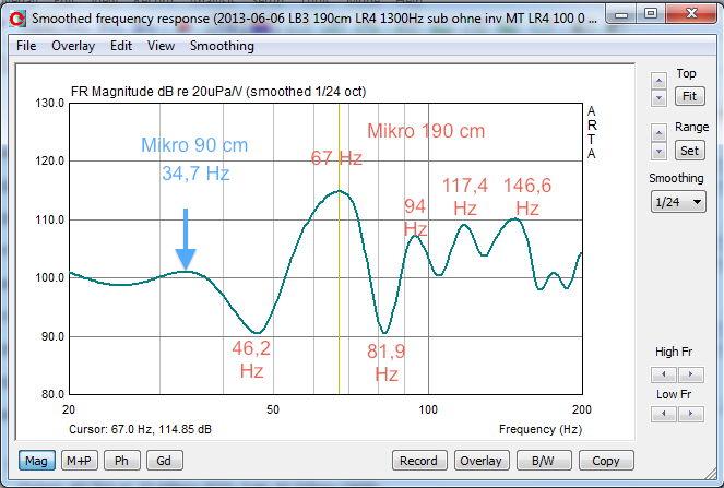 Mal eben mit der Messung aus Beitrag #149 verglichen (alte Messung aus 190 cm Entfernung, nur 1 Box, Mikro HT-Höhe, Richtung LS): Resonanzen bei 67 / 71 Hz, 94 / 93 Hz, 117 / 128 Hz, 147 / 151 Hz.