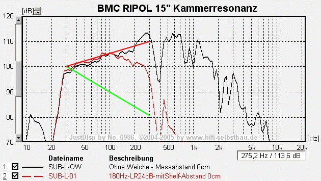 Die rote Linie zeigt den Frequenzverlauf, den es grob zu korrigieren gilt. Die grüne Linie ist der akustische 6 dB/oct Tiefpass, der (theoretisch) an der Ripolöffnung hergestellt werden muss, um im Fernfeld einen gleichmäßig horizontalen Frequenzgang zu erzeugen. Bei 300 Hz sind grob 28 dB zu kompensieren.