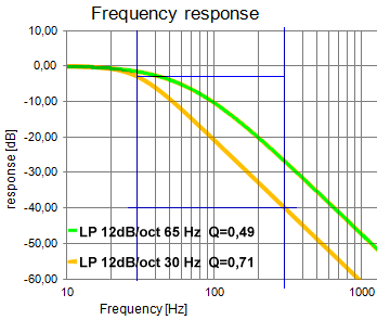 Wir sehen, wie die gelbe Kurve (Butterworth Tiefpass) bei 300 Hz überkompensiert (waagerechte blaue Linien). Näher dran ist die grüne Kurve (Linkwitz Riley Tiefpass).