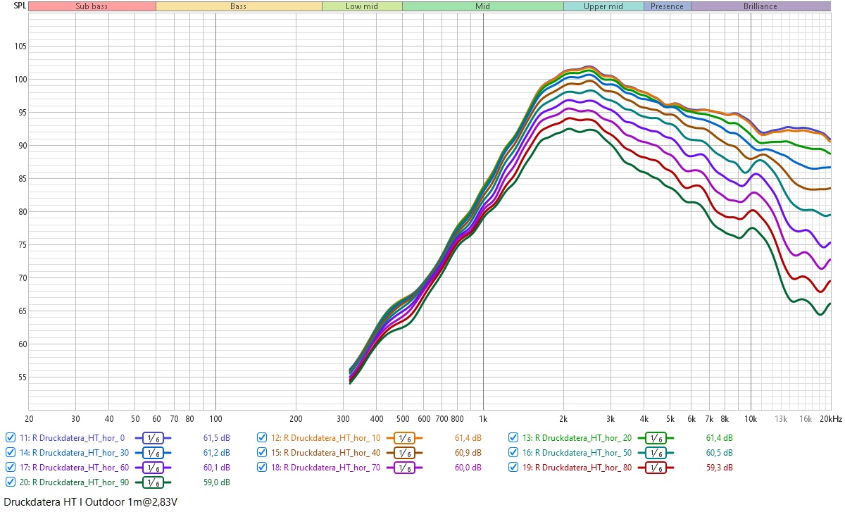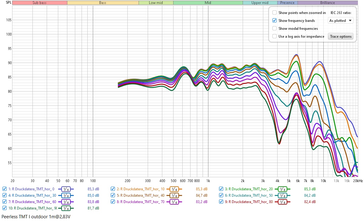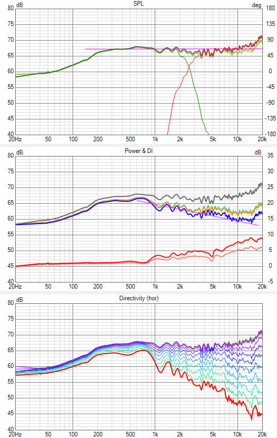 Das ist jetzt nicht mehr der Fall. Beim Hochtöner sieht man jetzt bei 4,5 bis 5kHz eine leichte Aufweitung und zwischen 10 und 12kHz eine ziemlich große Aufweitung. Bei 0°C Außentemperatur würde ich dem jetzt erstmal noch nicht zu viel Bedeutung beimessen. Der TMT sieht dafür jetzt deutlich besser aus. Allerdings ist der Frequenzgang für mich unter Winkeln noch nicht ganz plausibel, da die Bündelung noch immer verdammt früh einsetzt (für einen 4 Zöller). Der Drehpunkt lag dieses Mal aber definiiv auf der Schallwand.