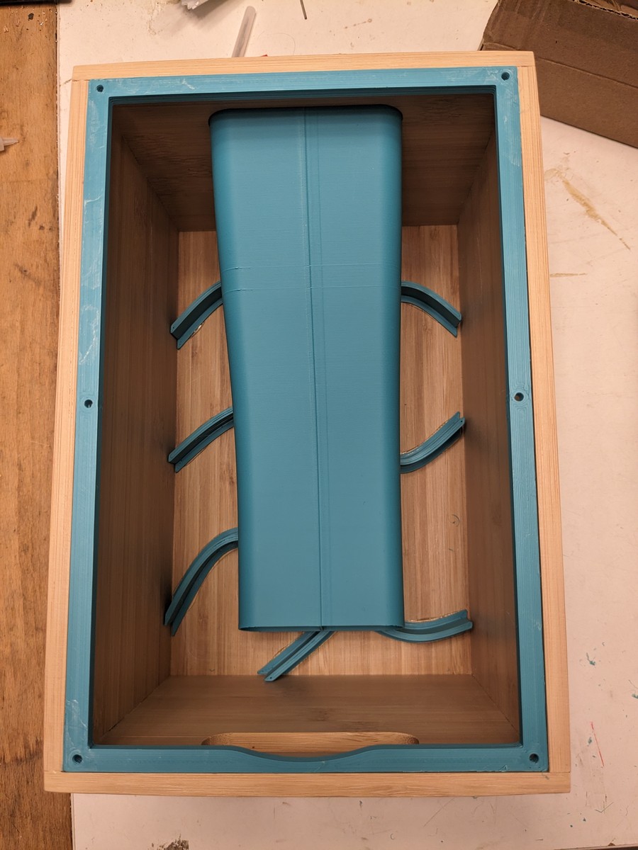 Die T-Stücke greife ich gerne auf, allerdings stört hier dann leider das BR Rohr, welches ich durch die obere Öffnung der Kiste führe. Das geht mit einer leichten Kurve nach hinten in die Kiste (und es muss leider ziemlich lang sein). Weiterhin ist die Maßhaltigkeit der Kiste ein Thema für sich. Was immer man Druckt muss 1-2mm in jede Richtung flexibel sein. Das habe ich beim Einbaurahmen für die Front zu spüren bekommen. Was man auch immer als Kleber nutzt: Der muss Spalte gut überbrücken können. Ich bin aktuell bei UHU MAx Repair Power, der ist sehr fest und dennoch zäh-elastisch und hinreichend spaltfüllend.