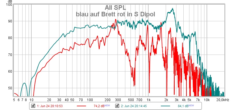 Nur um sicher zu gehen. dass ich es richtig verstehe. Du vergleichst Deine modulare einfache Schallwand ...ca. 40cm breit X 80cm hoch ...nur Basstöner oben (?) mit dem S-Dipol bei sonst gleichen Bedingungen. Erstmal herzlichen Dank für den Vergleich. Wollte ich immer schon mal sehen :).