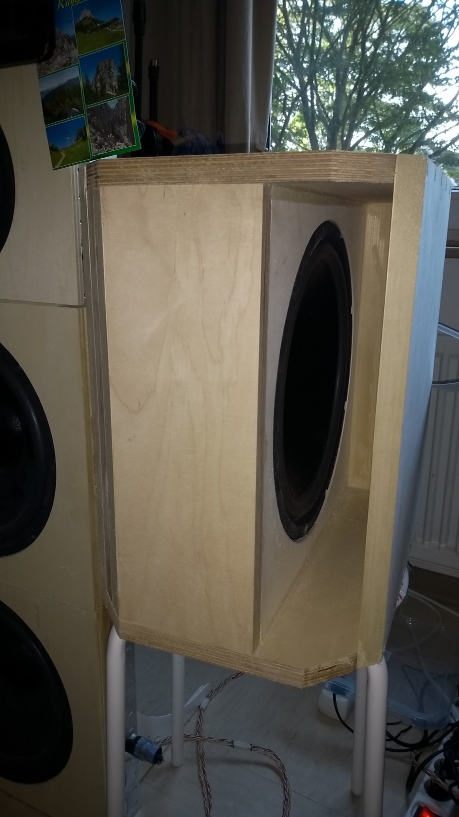 Oben kommt in Version 1; ein Kef Koax (Zitronenpresse) rein, Die abgeschrägten Kanten des Bassteil werden oben fortgesetzt und sollten für die Abstrahlung positiv sein und der Kantenreflexion entgegenwirken