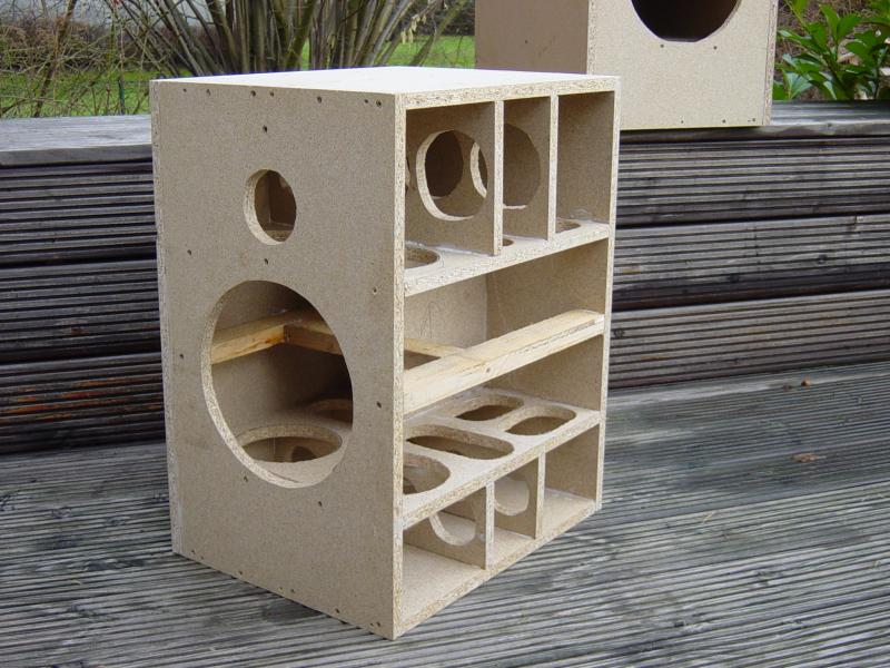 Ich habe darauf geachtet, dass die Kammergrößen alle unterschiedlich sind - soll heißen: Ich habe geradzahlige Vielfache bei den unterschiedlichen Abmessungen vermeiden können. So vermeidet man - zumindest in der Theorie - ausgeprägte stehende Wellen. Auch wenn's akademisch wirkt, schaden tut's in keinem Fall und die Kiste ist mit den Streben sehr steif.