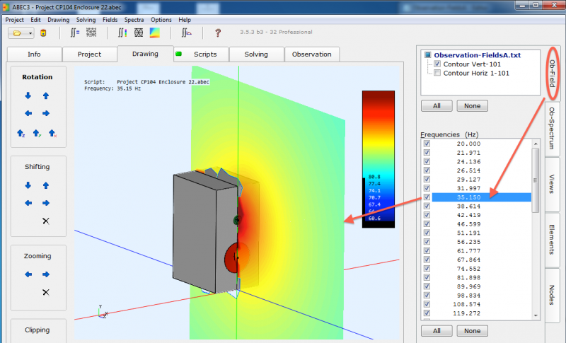 Die Simulation des Schalldrucks und der Abstrahlung auf der festgelegten Ebene kann nun für dies Frequenzen durch Doppelklick auf die jeweilige Fequenz im Fenster 'Ob-Field' (rechts im ABEC-Fenster) angezeigt werden: