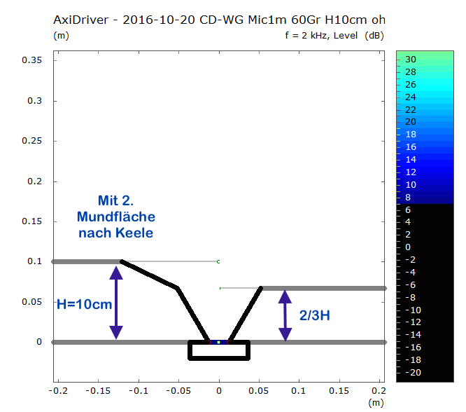 Wenn man dann noch einen realistischen Hörabstand von 3m annimmt (siehe Hinweis nailhead), liegt der zu erwartende Einbruch bei knapp 17 kHz - und 'verschmiert' durch die flache Geometrie und die 25mm Schallquelle auch noch stärker. Selbst ohne Verrundung des Mundes (was bei den kommerziellen Waveguides in der Regel gemacht wird), ist kaum noch eine Aufweitung zu sehen.