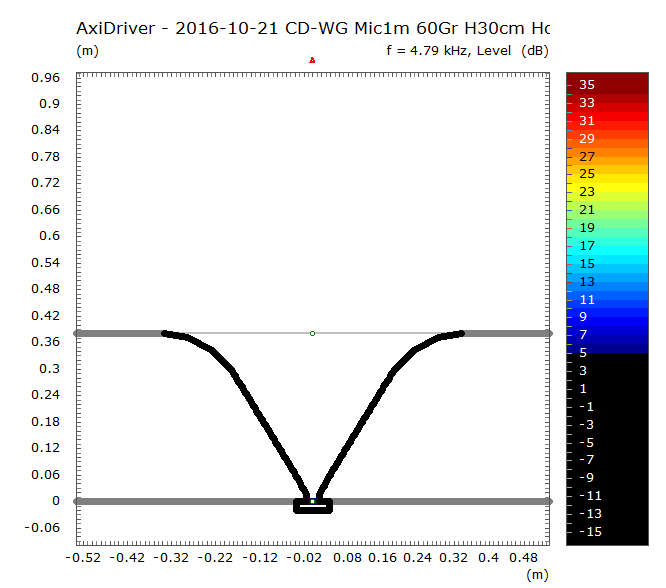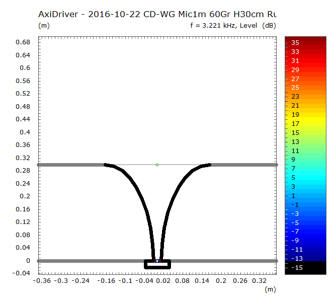 Der Grund für den Ausflug? Na ja, ich freue mich gerade an den Diskussionen um das Kugelgehäuse und die schön offene Sichtweise, die Nils da gerade wieder eingebracht hat - und irgendwie ist ein (konisches) Horn auch nix anderes als eine nach vorne geborgene Scheibe (und eine Kugel ja auch nur eine umgestülpte Scheibe...;)). Und die Betrachtung der 180°-Schallführung ganz am Anfang des Threads (Beitrag #10) war ja nicht ganz fair, da sie direkt in eine unendliche Schallwand überging. Daher an der Stelle die Simulation einer Scheibe mit 37,1cm Durchmesser (=Mund-Durchmesser des 60°/30cm WGs), aber 1m vor die unendliche Schallwand gesetzt, die AxiDriver halt immer macht: