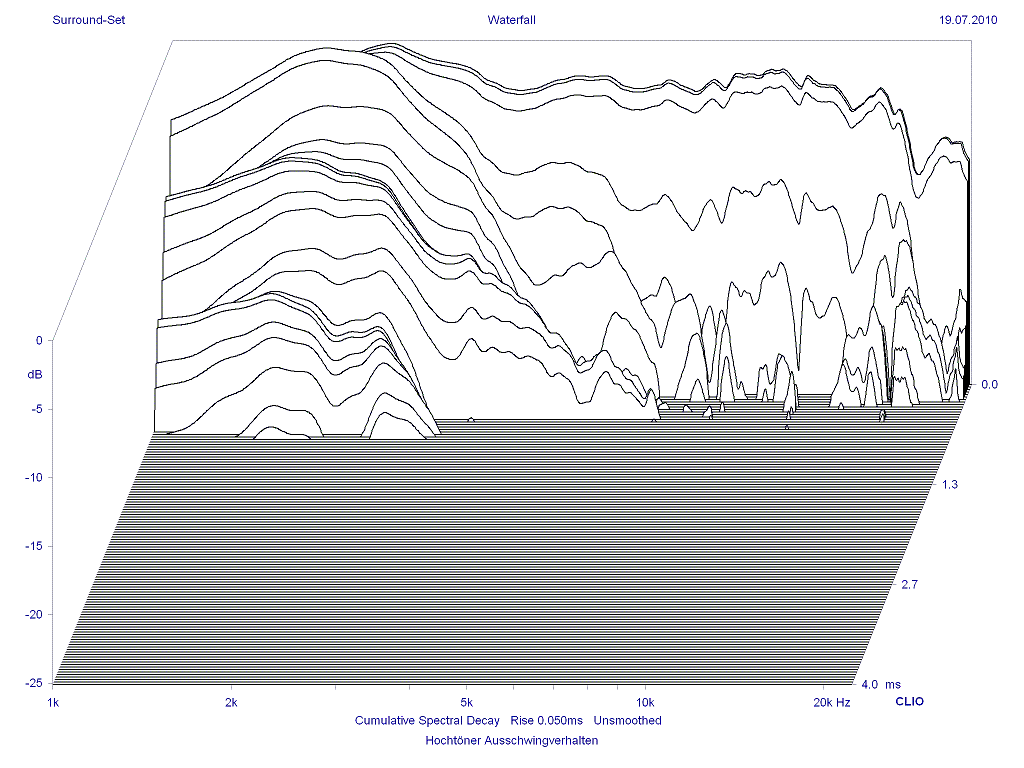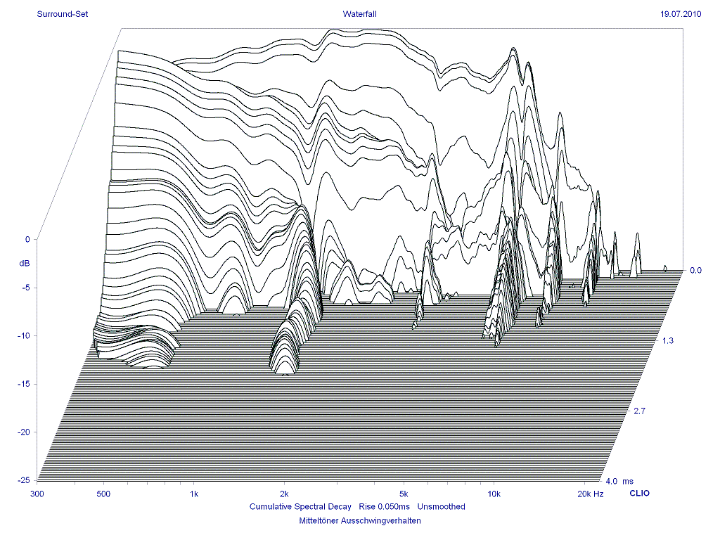 Leichte Probleme sind bei 3kHz und bei 7kHz zu entdecken. Hier kann vielleicht mit der Weiche noch minimal Pegel rausnehmen, um unangenehme Überhöhungen unter speziellen Sitzpositionen zu vermeiden. Die Energieabgabe ist in der Summe aber schon jetzt absolut ok.