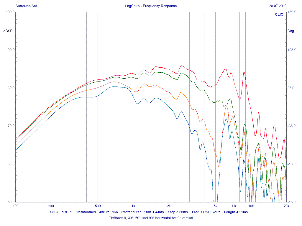 Dann habe ich den Frequenzgang unter diversen Winkeln betrachtet (in drei verschiedenen Höhen (ca. 0°, 20°, 40° (vertikal) jeweils drei Messungen unter ca. 0°, 20° und 40° (horizontal)):
