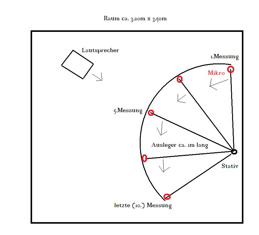 Einmal im Messraum (eher hallig, Dachschräge, Wände zum Teil massiv, zum Teil Gipskarton, Raum steht voll mit Werzeug und Baumaterialien, also gute Diffusion, schlechte Absorbtion) mit der bekannten Drehung am Mikrostativ. Der Lautsprecher steht auf ca. 1,30m Höhe frei direkt vor der Wand, das Mikro auf der gegenüberliegenden Seite.