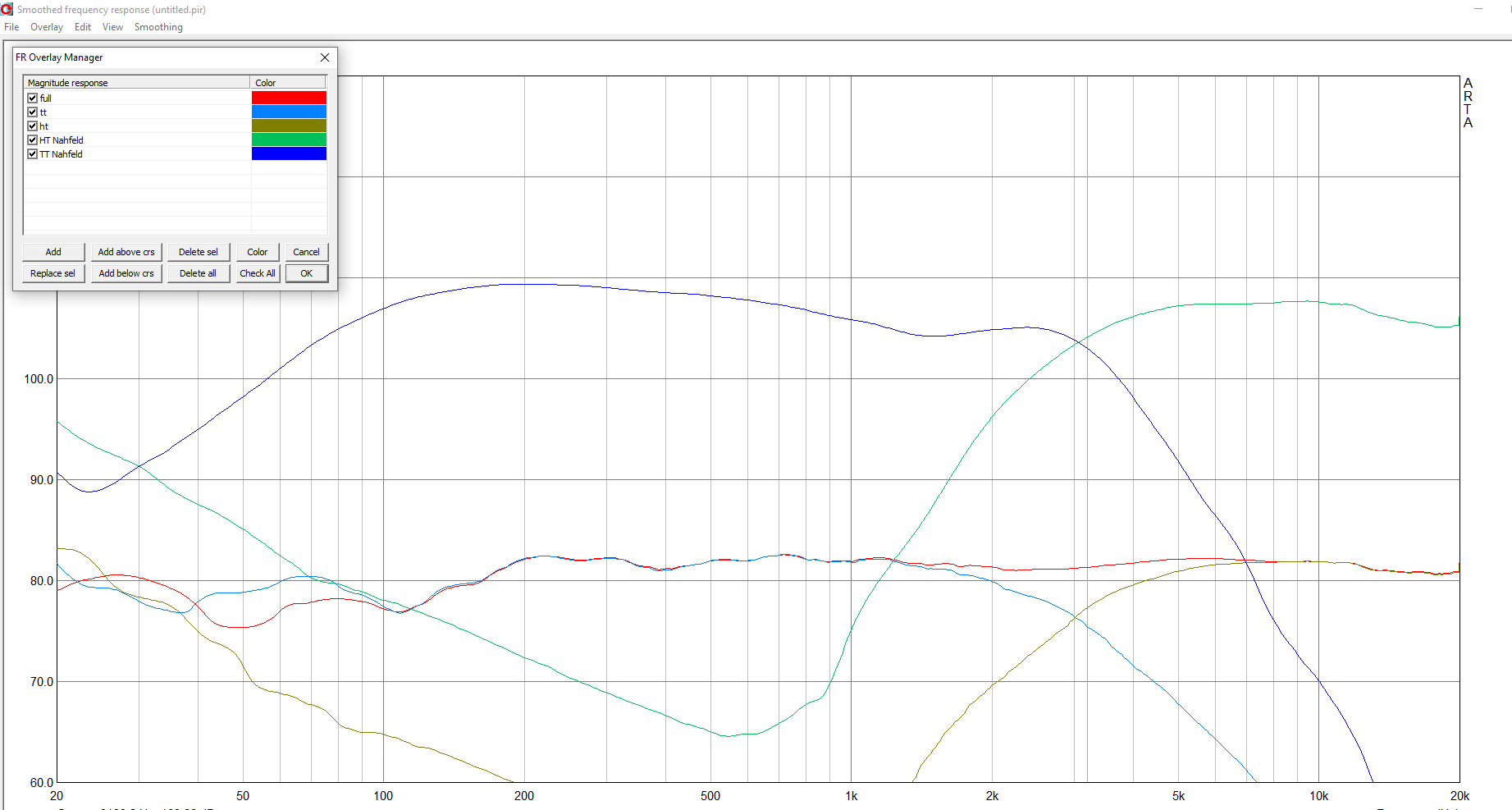 (da ist jetzt auch das vertikale Verhalten im Bündelungsmaß und EFG mit drin, das bekommt dadurch im Bereich der Trennung natürlich einen kleinen Schlenker. Ja ist aktiv mitm DSP glattgezogen und mit LR48 getrennt. Sieht aber mit LR24 nicht groß anders aus. Läuft ohne Laufzeitkorrektur.)