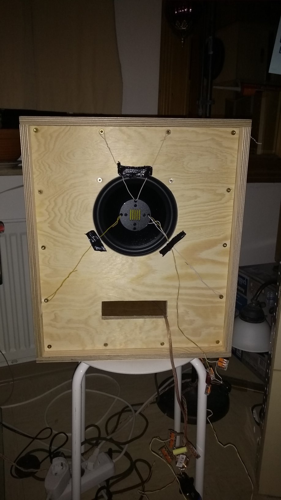 Die Bassmitteltöner raus geschraubt, um an die Weiche zu kommen.