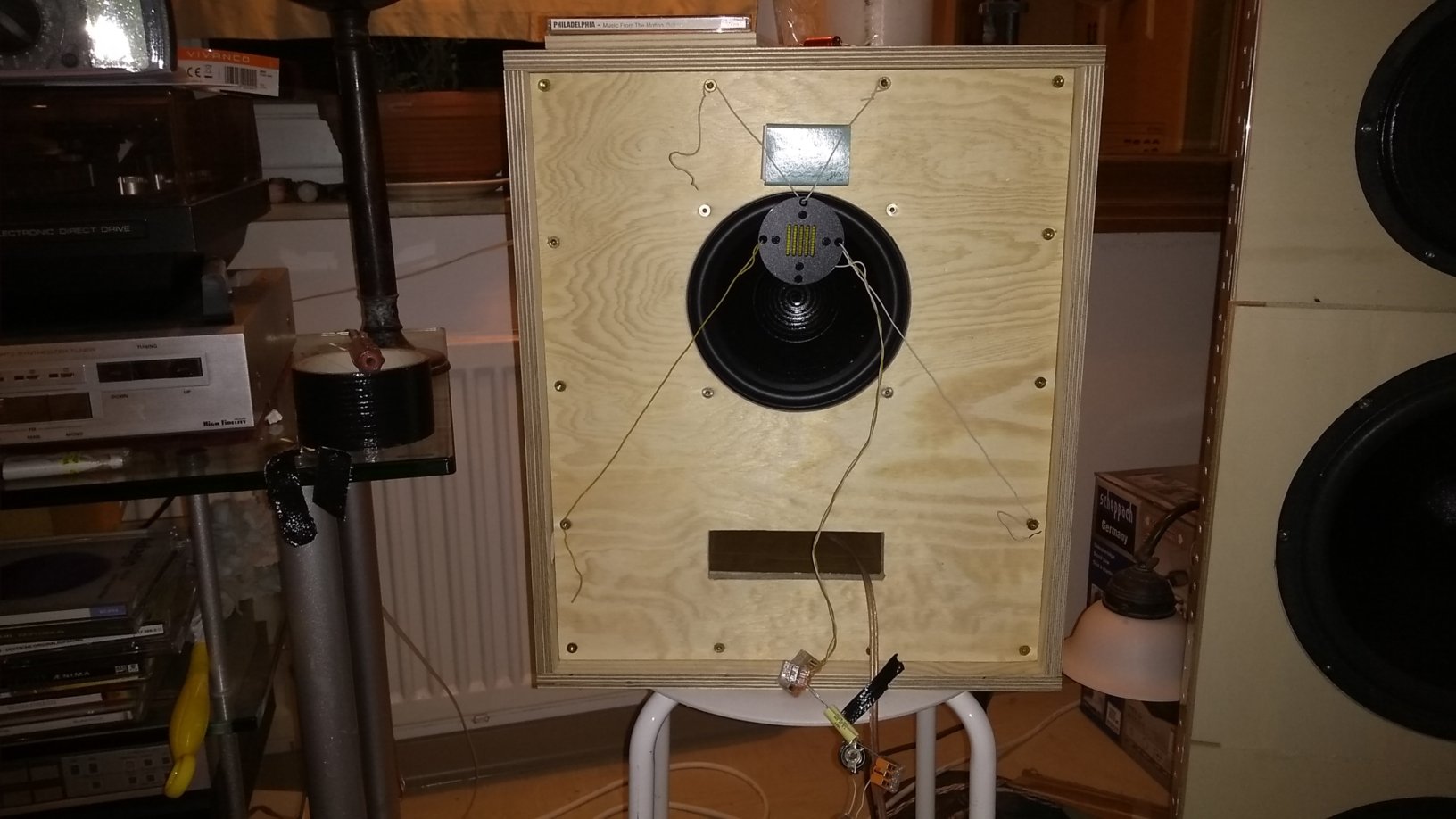 ich würde den HT etwas nach oben verschieben, so dass Du nicht Mittig best. Dürfte das Abstrahlverhalten beim großem Chassis weniger beeinflussen.