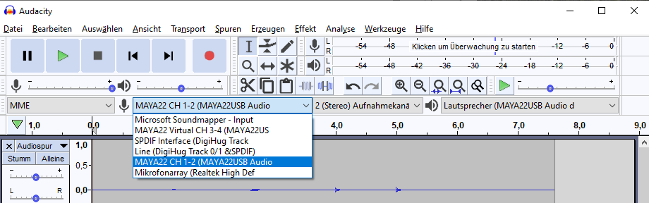 In Audacity habe ich bisher nur gefunden, wo man das gewünschte Audio Device auswählen kann,