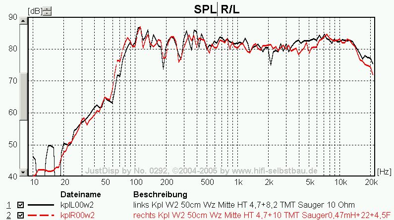 Die TMTs haben einen Sperrkreis für den 4Khz-Peak und einen ganz dezent arbeitenden Sauger, der zwischen 3 und 6KHz 2-3DB wegnimmt. In der rechten Box habe ich den Kondensator von 2,7 auf 4,5myF erhöht. Die rote SPL- Kurve hat trotzdem einen unschönen Knick. Der geht nicht weg. Dafür ist aber der Pegel in den Mitten genau gleich.