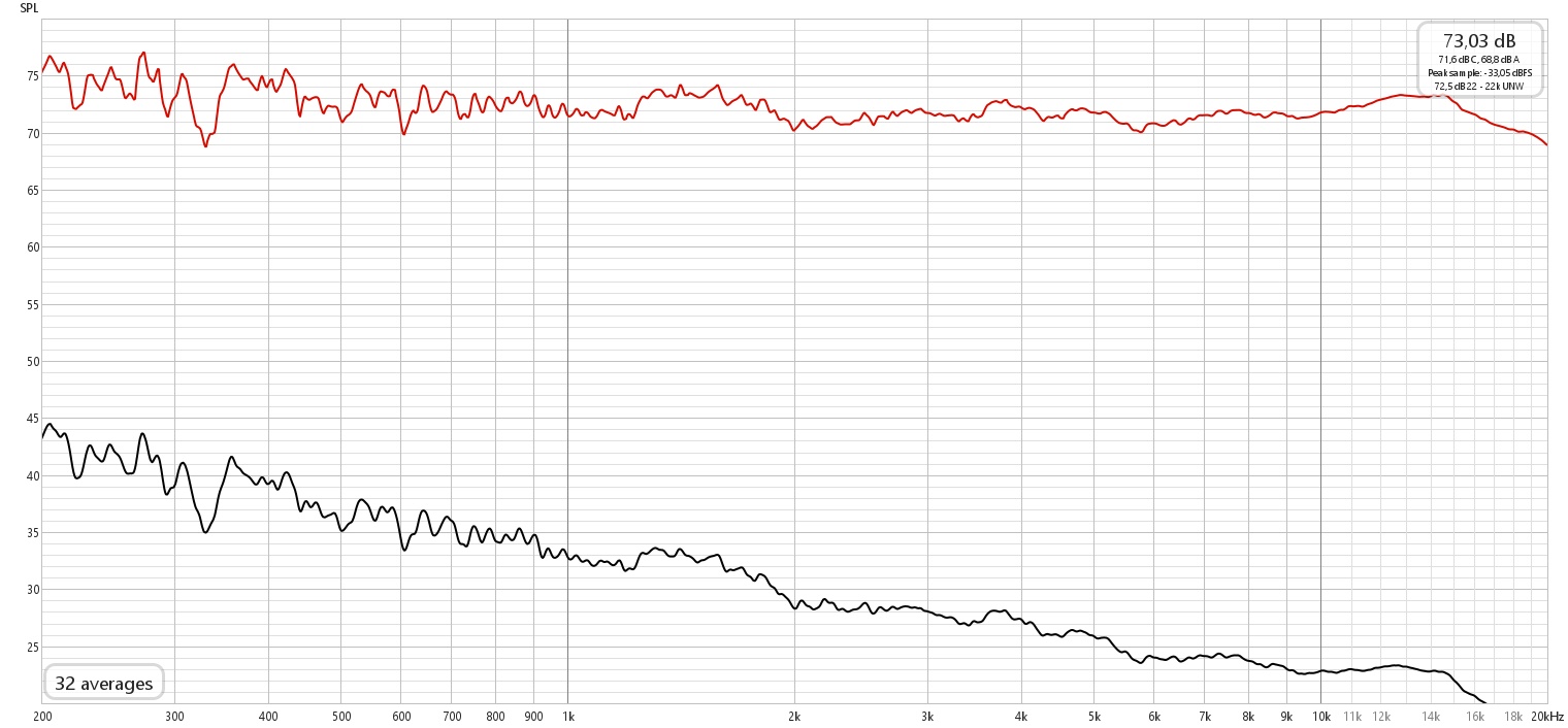 Zur Verdeutlichung nochmal eine Wedelmessung einmal als "Spektrum" (schwarz) sowie als "RTA" (rot) dargestellt.