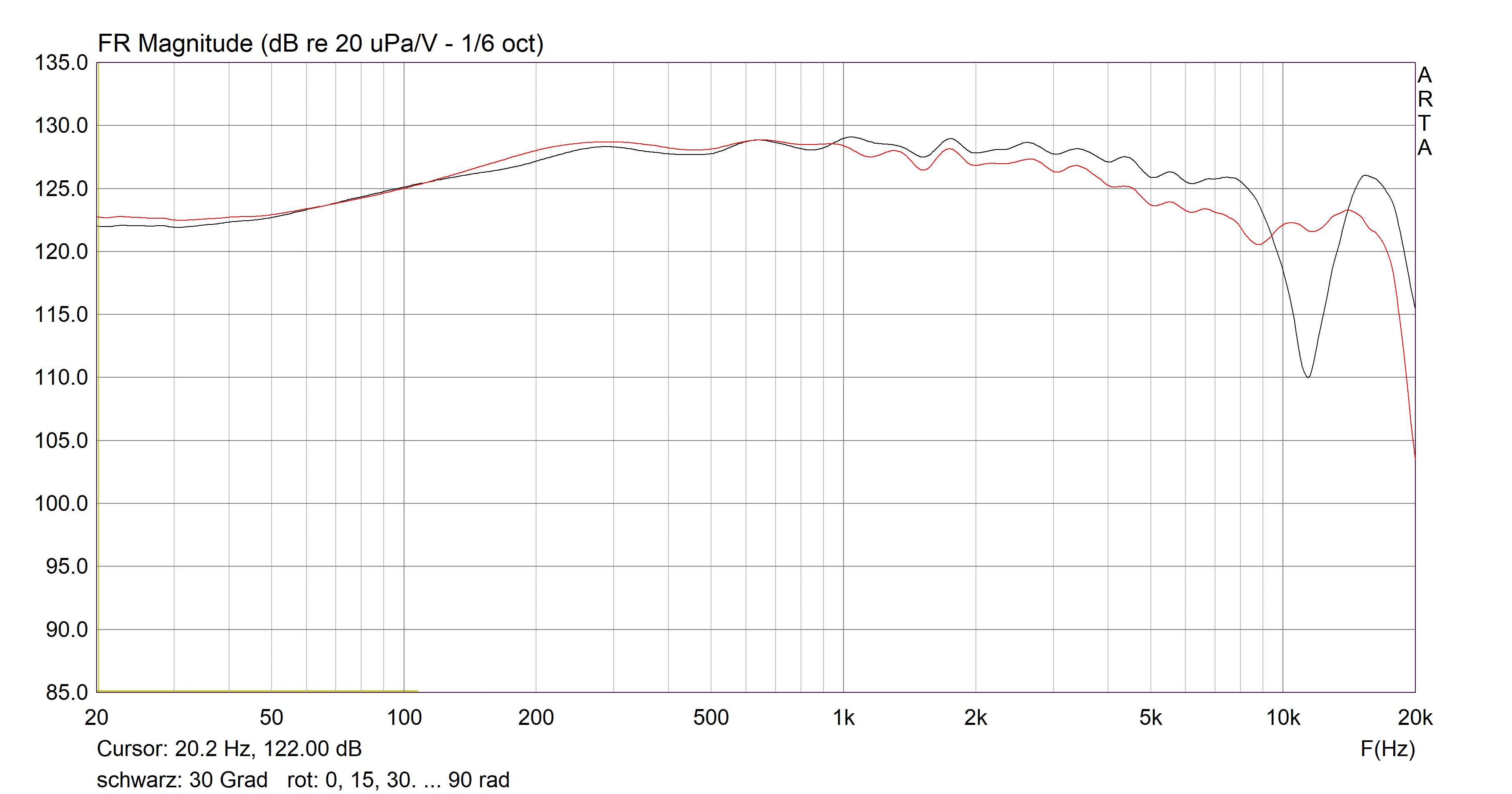 ich experimentiere gerade mal wieder mit ein paar Testboxen (3 Wege im Monitorstil mit MT-Kalotte. Dabei ist mir folgendes Phänomen aufgefallen: summiere ich 0-90 Grad Messungen in 15 Grad-Schritten (zu mehr war ich heute zu faul), erhalte ich nahezu deckungsgleich die 30 Grad-Kurve. :eek: