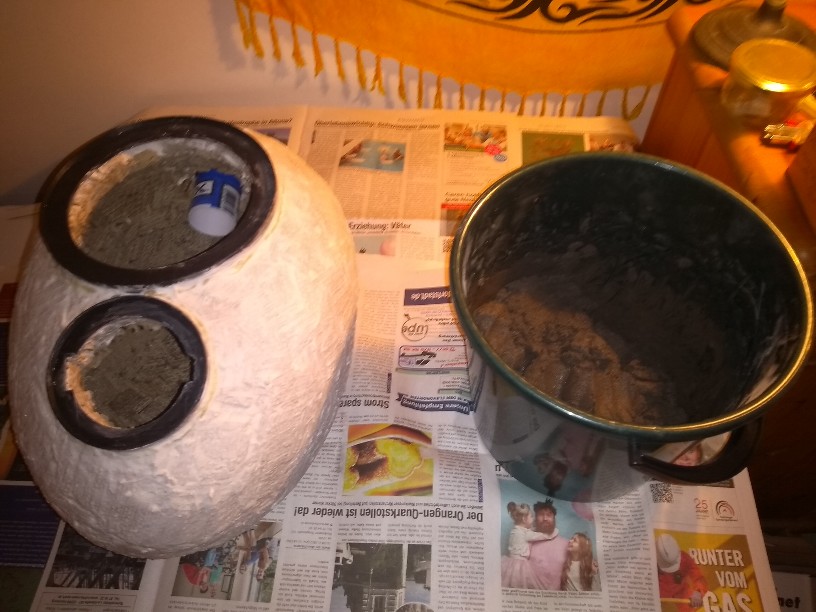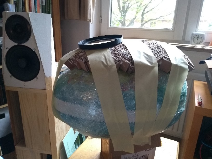Den Kern um den ich das aufbaue ist ein 35cm Nestler Füllei. Der Kern kommt nach dem Rohbau raus. So schön wie das Styropor-Ei ist das Pappe-Ei nicht, aber es wird seinen Zweck schon erfüllen.