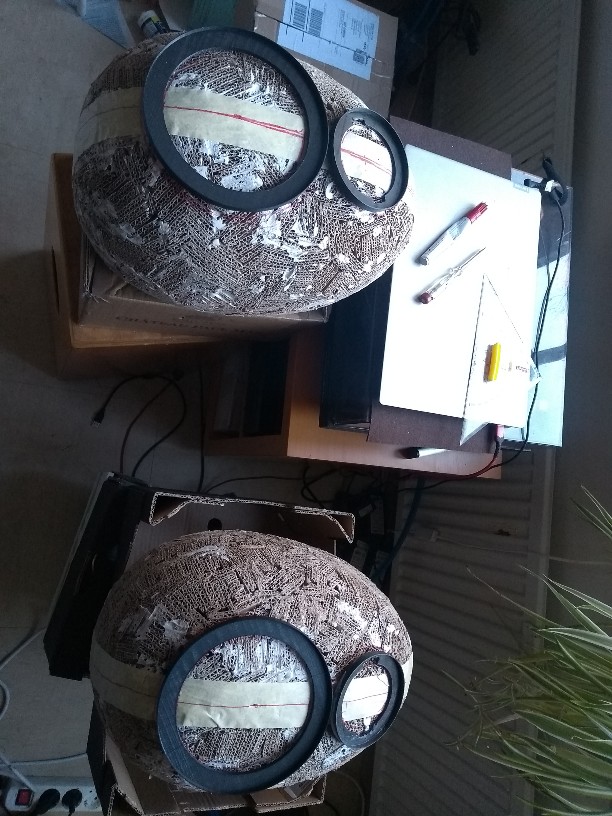 Durch den Erfolg mit "Das Ei" baue ich ein dezent Größeres. Genau so aufwendig mit Pappkartonabschnitten, allerdings dieses mal 3x3cm. Das dauert ein wenig, gibt aber das entsprechende Volumen, bei geringer Baugröße, ist stabil und akustisch vorteilhaft.