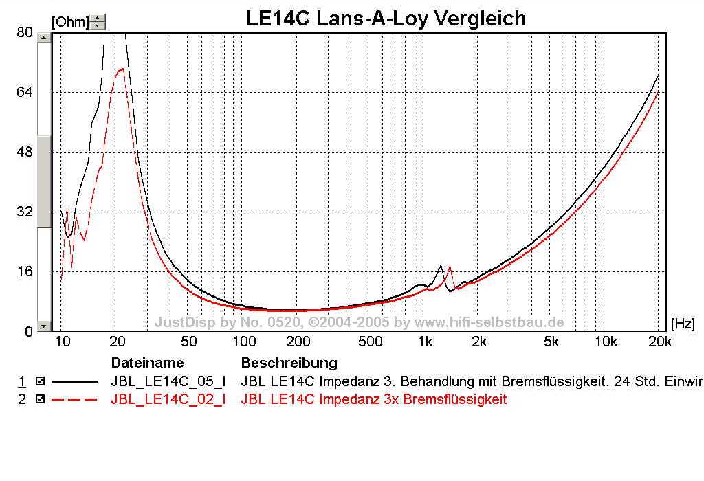 Im Moment ja, aber die Sicke wird ja wieder fester, wenn das Latex drauf kommt. Dann steigt die Reso und auch der Qts. Franky war übrigens so cool (tolles Wortspiel, oder??? :D), mir ein Paar JBL PR10 Passivmembranen mit Lans-A-Loy Sicken zu geben, damit ich Versuchsmaterial für die Latexbehandlung habe. Bei Einer war das Lans-A-Loy schon zerbrochen, die zweite war noch ganz aber Betonhart (deutlich härter als meine LE14). Die ist inzwischen wieder weich dank DOT-3 und einsatzbereit.