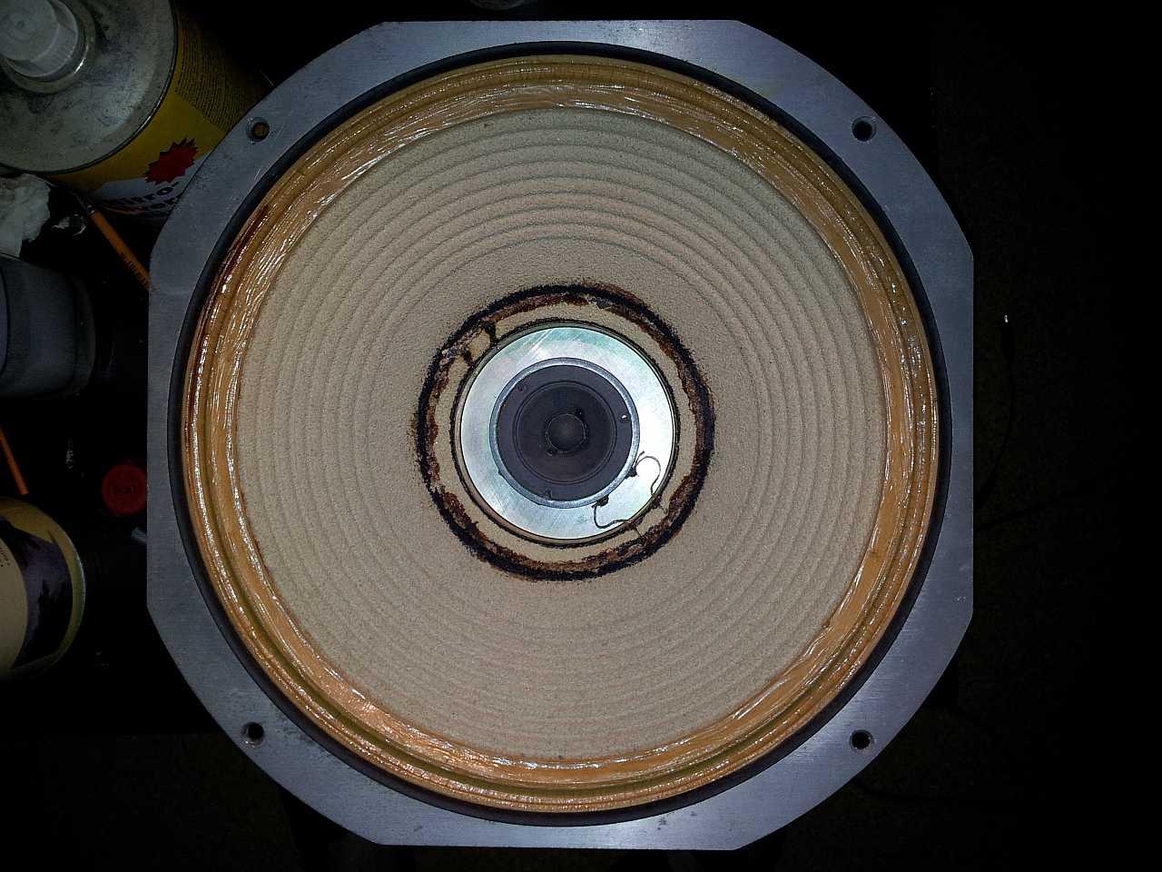 1. Die innere Zentrierung (Die eigentlich nur ein Schutz gegen Fremdkörper für die Schwingspule ist) muß entfernt werden. Also hab' ich den Rand nach bewährter machart mit Aceton behandelt, bis der Kleber sich gelöst hat. Sieht dann so aus: