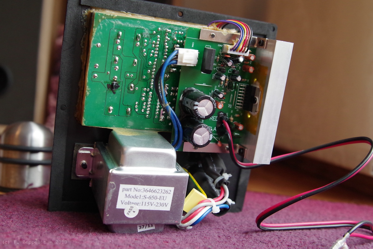 Vielen Dank für die Fotos. Steht auf dem Chip (der 15-Beiner am Kühlkörper) zufällig LM4766 drauf? Dann kann der in Brückenschaltung und bei guter Kühlung 80 W an 8 Ohm. Woher die Angaben zu 160 W Musik und 80 W Sinus bei 4 Ohm kommen sollen, ist mir nicht klar. Der Hersteller spect das Ding nur bei 8 Ohm und gibt noch Kurven für 6 Ohm an. Bei 4 Ohm in Brückenschaltung dürften die Verzerrungen deutlich ansteigen , und bei 160 W spricht die Strombegrenzung an.