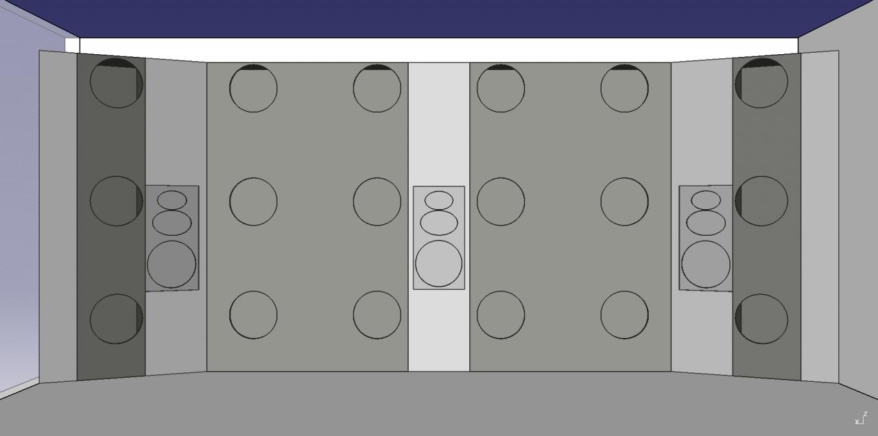 Die Messung ist kalibriert (Mikrofon, Soundkarte, SPL). Das Mikrofon stand in der Mitte des Raumes, damit die 1. Längsmode keinen Einfluss hat. Die beiden Säulen standen auf 1/4 und 3/4. Die Längsmode 2. Ordnung wird später von dem rückwärtigen Absorber vollständig bedämpft, so wie in dem verlinkten PDF beschrieben.