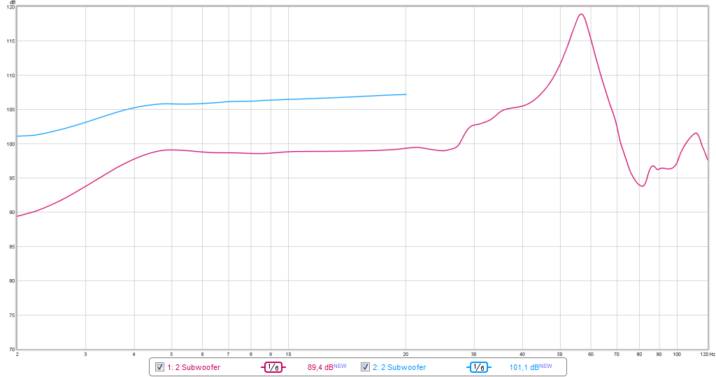 Es kam kein Equalizer zum Einsatz! Dank des Druckkammereffekts liegt die untere Eckfrequenz bereits so schon bei 3,3 Hz. Bei 105 dB habe ich aufgehört, den Pegel zu erhöhen. Viel mehr vertragen die 6 Treiber bei den Frequenzen < 20 Hz mechanisch auch nicht. Durch die anderen 12 Treiber kommen dann im fertigen Zustand noch mal +9 dB Maximalpegel hinzu. Dann komme ich ziemlich genau auf den simulierten und abgeschätzten Wert.