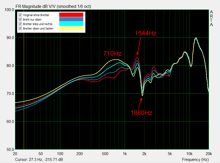Bzgl. meines kleinen Schallwandexperiments hatte ich eigentlich erwartet, dass ein Peak, der durch die Abmessungen zustande gekommen ist, komplett verschwindet. Stattdessen ist dann woanders wieder was dazugekommen.