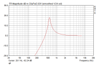 Extrem hoher Qts-Wert - Dosenfutter - 12.05.2013 Chaomaniac schrieb:Auf die Q-Werte hat die Messmethode (Volumen/Zusatzmasse) keinen Einfluss. Doch, hat sie. Durch die Meß(un)genauigkeit. Extrem hoher Qts-Wert - Chaomaniac - 12.05.2013 Nein, hat sie nicht. Zur Ermittlung der Q-Werte benötigt man keine zweite Impedanzmessung, sie werden aus der Freiluftmessung bestimmt. Extrem hoher Qts-Wert - H0rn - 12.05.2013 Ich hab noch mal als Test einen bekannten Treiber gemessen (den Dynavox DY166-9A). Auch hier ist ein zu hoher Qts-Wert erkennbar (wenn man der Messung hier Vertrauen schenken möchte:http://boxenbastler.de/Dynavoxdy1669a.pdf). Extrem hoher Qts-Wert - Dosenfutter - 12.05.2013 Chaomaniac schrieb:Nein, hat sie nicht. Das kann man so machen. Man kann es aber auch anders. Extrem hoher Qts-Wert - Chaomaniac - 12.05.2013 Dosenfutter schrieb:…Man kann es aber auch anders. Wie und wieso? Extrem hoher Qts-Wert - Dosenfutter - 12.05.2013 Weil jede Meßmethode Vor- und Nachteile hat. Extrem hoher Qts-Wert - Chaomaniac - 12.05.2013 Mit welcher Messmethode bestimmst Du die Gütewerte? Extrem hoher Qts-Wert - H0rn - 12.05.2013 Liegt meine Qts-Messung des Dynavox noch in den natürlichen Schwankungen der Chassis-Herstellung oder ist der zu hoch im Vergleich zur der Boxenbastler-Messung? Extrem hoher Qts-Wert - Chaomaniac - 12.05.2013 H0rn schrieb:Liegt meine Qts-Messung des Dynavox noch in den natürlichen Schwankungen der Chassis-Herstellung oder ist der zu hoch im Vergleich zur der Boxenbastler-Messung? Es gibt öfter Abweichungen in dieser Größenordnung. Faktoren können unter anderem sein: Temperatur, Messmethode, Spannung, Anregungssignal, Einspielzustand, Lage des Chassis bei der Messung, Serientoleranzen, … Auf mich wirkt Deine Messung jetzt nicht unrealistisch. Genauer könnte man es beurteilen, wenn der Parametersatz komplett wäre (also mit den Parametern, die aus der Aufhängungsnachgiebigkeit berechnet werden). Extrem hoher Qts-Wert - H0rn - 12.05.2013 Hab die restlichen TSP mal angehängt, glaub ihr die passen von der Toleranz her? |