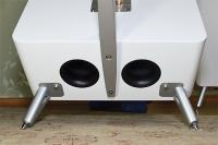 Diese steht auf drei Beinen mit einem längeren Ausleger nach hinten, alles aus verchromten Metall. Die Lautsprecher stehen damit absolut stabil und kippfrei.