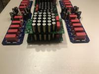 Anstatt einen großen Elko zu nehmen habe ich viele kleinere parallel geschaltet. Das ergibt einen deutlich geringeren Innenwiderstand ESR. Die Platinen und Elkos hatte ich noch von einem anderen Projekt, das nie fertig wurde. Ich werde noch austesten, ob sich der Einsatz von schnellen Gleichrichterdioden gegenüber Brückengleichrichtern qualitätsmäßig bemerkt macht.