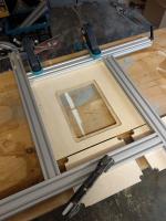 • Das Fügen der Einzelteile der „Holzbox“ ging so von statten: mit eingesetzten Blechen Seitenteile und Deckel verkleben. Die Verbindung von Bodenteil und der Restkiste muss wieder lösbar sein. Deshalb verwendete ich dafür, nach Aushärten des Klebers, ein Paar Holzdübel zur Ausrichtung und Spax zum Verschrauben.