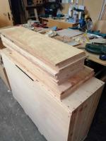 Olli hat mir eine Tischkreissäge geschenkt, mit der ich die 36° versucht habe zu sägen. Ging mit Versuchsbrettern ganz gut. Ich hatte nur kein Holz. Zum Glück habe ich Freunde auch in Schwelm. Darko hat mir Kistensperrholz vermacht und auch gleich zurechtgesägt[ATTACH=CONFIG]56063[/ATTACH]