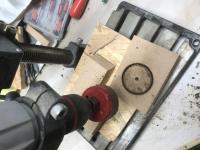 Außerdem habe ich eine kleine Bohrhilfe angezwingt. Das verhindert das Rotieren der Brettchen (ASI) und dient der Arbeitsgeschwindigeit, da ich nur das erste Brettchen anzeichnen musste. Einlegen und losbohren.