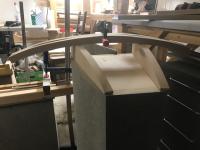 Okay... ich nutze erstmal 3 Brettchen Bauhöhe und will ein paar Bögen. Einen für die Fräse und einen fixierten. In der Mitte des OF-Bogens haben wir mehr als 3 Brettchen Gesamthöhe, also den fixierten Bogen bisschen abflachen, bis es passt. Natürlich alles mit der Stichsäge.