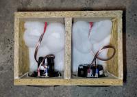 Das ursprüngliche Testgehäuse wurde, da sich trotz starker Bedämpfung Gehäuseresonanzen nicht ganz eliminieren liessen, was wohl der Würfelform geschuldet war, verworfen. Es wurde ein neues gebaut, bei dem sich keine Seitenlängen decken - Breite 16, Höhe 19, Tiefe 22 cm. Das ergibt nun ein etwas größer als angedachtes Volumen, was aber das geringste Übel ist; in jedem Fall wird so verhindert dass sich stehende Wellen überlagern und zu einer "Super-Mode" führen. (Beim finalen Gehäuse wird im übrigen eine Trapezform o.ä. zur Brechung der stehenden Wellen zum Zuge kommen.)