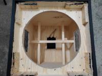 Gehäusematerial für die Tieftonsektion ist 15mm Kiefer-MPX. Gewählt aufgrund Gewicht. Ad Verstrebung: nachdem ich über die Jahre etliche male deutlich größere Lautsprecher als diesen als unverstrebter Faserplattenprototyp zu stark verstrebtem Fertiggehäuse vergleich-gehört und -gemessen habe, hat sich meine Erwartungshaltung (die gleiche die wahrscheinlich jeder vor dem direktem Vergleich hat) effektiv aufgelöst, und ich gelernt in dem Punkt nicht zu viel Aufwand zu betreiben. Trotz dessen kam die übliche "obligatorische" doppelte Kreuzstrebe aus 22mm Quadratleiste, mit zusätzlicher Abstützung zur Rückwand, rein - die paar hundert g Holz tun beim Gesamtgewicht nun auch nicht mehr weh.