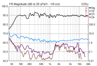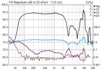 Kontrollmessung ungefenstert im 11qm-Raum aus ca. 50cm Entfernung, Box steht auf Höckerchen: [ATTACH=CONFIG]67690[/ATTACH] Ein Rest der HT-Membranresonanz ist noch übrig. Im Klirrverlauf sind die Vorechos aber jetzt effektiv unterdrückt, auch sonst schaut das gut aus: [ATTACH=CONFIG]67691[/ATTACH] (Die 90dB sind korrekt, Messentfernung ca. 30cm. Der k2 kommt vom Mikro...) So macht sich übrigens ein HT bemerkbar, bei dem die Schwingspule leicht im Luftspalt kratzt: [ATTACH=CONFIG]67692[/ATTACH] Im Frequenz- und Impedanzgang war nix zu sehen, mit nem 100Hz Sinus auf den HT aber dann auch sofort zu hören... Naja das war schnell behoben. (Das war ich selbst, ich hatte die zuletzt ausseinander geschraubt...) Hier nochmal der gemoddete TT alleine unbeschaltet in der Box: [ATTACH=CONFIG]67693[/ATTACH] (Der Pegel ist korrekt, Messentfernung ca. 30cm. Der k2 kommt vom Mikro...) Und hier nochmal im Nahfeld (Pegel undefiniert, aber vglw. gering): [ATTACH=CONFIG]67694[/ATTACH] Die jew. 6 Löcher im Reflexrohr habe ich nochmal auf 4mm aufgebohrt und die Bedämpfung minimal optimiert (etwas dünner gezupft wo der Spalt enger wird, vorher war's etwas gestopft): [ATTACH=CONFIG]67695[/ATTACH] Das reicht mir erstmal so. Für ein abschließendes Urteil ist es noch zu früh, ich höre seit ca. 1h. Erstmal soviel: Das ist ne derart ernsthafte, lineare und nebengeräuschfreie Geschichte dass sich die 3k€-Aktivboxen welche gerade dahinter stehen ein wenig schämen, was bei Detailauflösung und Selbstverständlichkeit bei der räumlichen Abbildung so gehen kann. Der Grundton kommt durch die fast vollständige Bafflestepkompensation recht kräftig (zumindest wenn man viel breitere Schallwände gewohnt ist), und im Bass gibt's auch richtig Power, da vermisst man bis zu gehobenem Pegel nix. Im Gegenteil, der kleine SB puncht so ordentlich dass ich über einen stabileren Ständer nachdenke, auf den wackeligen Dingern aktuell hört sich dass minimal "weich" an (ich kenne den Effekt, hatte daher früher mal einen Stapel Pflastersteine als LS-Ständer...) Viele Grüße Peter