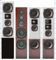 In der Zwischenzeit hab ich mich um Elektronik, Chassis und DSP gekümmert (dazu ggf. später mal mehr), hier soll's aber weiter um Design gehen. Mich hat das Aussehen der BM 10d Box angefixt als ich an einem Foto vorbeikam und so könnte ich die segmentierte Schallwand vorerst hintanstellen und mit einem Brett als (aufgedoppelte) Schallwand versuchen schneller zu musikmachenden Boxen zu kommen. hier Frontansichtvergleiche von Original BM 10d, ursprünglicher Omega und meinen Umbauideen für 3-Weg und 4-Weg: