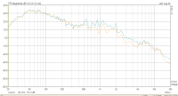 Die Nahfeldmessung vom BR-Rohr zeigt einmal mit (orange, an den Seitenwänden) und einmal ohne Dämmung (grün). Ich hab auf Dämmung komplett verzichtet da es anscheinend nicht wirklich was bringt.