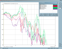 Frequenzgänge des Tiefmitteltöners im Nahfeld an verschiedenen Stellen – siehe auch Text oben (grüne Kurven: Staubschutzkalotte; rot und pink: Membran; lila: Sicke)