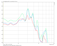 SPL der Chassis ohne Bedämpfung: Original (blau); nach dem ersten Dämpfungsversuch (grün); nach dem zweiten Bedämpfungsversuch (rot)