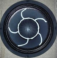 Da ich noch nicht dazu gekommen war, mir Beschichtungsmittel für Membranen zu besorgen (Visaton und IT haben meines Wissens sowas im bezahlbaren Rahmen im Programm) habe ich mich an einige Entwickler erinnert, die Resonanzen großer Breitbänder mit auf die Membran aufgeklebten Filzdämpfern bekämpft haben oder zumindest das wollten. Dabei wollte ich wegen der Optik keine Dämpfer aus Filz einsetzen, sondern habe mit Schaumstoffdichtstreifen experimentiert, die ich auf die Kalotte aufgeklebt habe. Bei wenigen Streifen erinnert das ein wenig an die Relevator-Chassis von Scanspeak, aber die Wirkung war so gering, dass es nicht bei wenigen Streifen blieb, wie das folgende Bild zeigt…