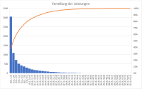 Die Verteilung der Spannungen ist eine fast mustergültige Normalverteilung. Die Verteilung der Leistungen zeigt, wie wenig die extremen Spitzenwerte auftreten. Das sagt ja auch der hohe Crest-Faktor aus.