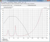 dann den Frequenzgang mit BoxSim nachgebildet (HP 2ter Ordnung +HP 1ter Ordnung) u. den 15LB075 UW4 in ein 90Liter Br-Gehäuse gesteckt (Fb 33Hz) Trennung nach oben ca. 90 Hz.