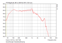 eine Bitte, wäre es möglich die Diagramme etwas größer zu machen? Für angenehmes betrachten muss ich um 300% vergrößern, da wird das Ergebnis schon ziemlich unscharf. Ansonsten immer weiter so...:prost: Wäre noch schön zu sehen, was Visaton als die "echte/wahre" Messung ansieht (also deren Messungen). Zitat:Zwei Fragen: Verwende zum Messen immer eine Kabellänge wie sie später auch am LS zum Einsatz kommt. In meinem Fall 4-5m Kabellänge mit größerem Querschnitt. Vor der Messsession wird Limp gegen einen Referenzwiderstand am Messkabel "geeicht". Die Messung erfolgt dann mit "periodic pink noise". Die Messspannung liegt bei mir wohl zu hoch, da ich den Messverstärker nicht dauernd verstellen möchte - also i.d.R. bei 2,83V. Gruß Armin
